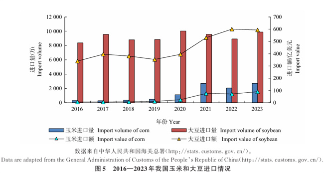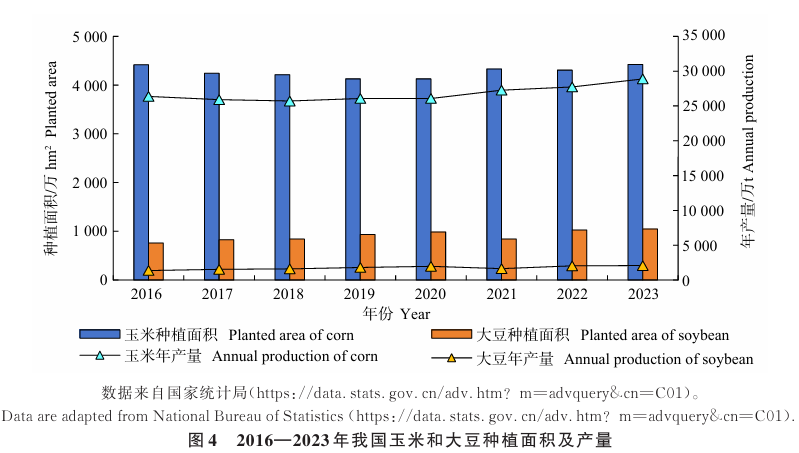 2023年,我國(guó)大豆的單產(chǎn)為1.99 t/hm²;2016—2023年,我國(guó)玉米的單產(chǎn)從5.97 t/hm²增長(zhǎng)到6.53 t/hm²。