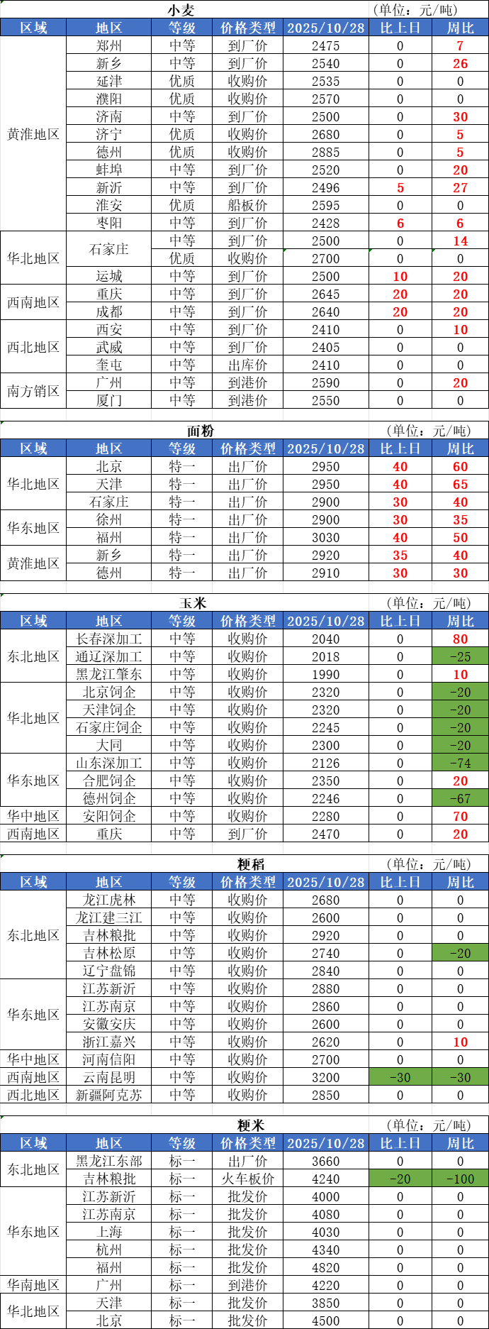 1、10月28日,小麥加工企業(yè)收購價(jià)格延續(xù)漲勢,山東、河南部分企業(yè)小幅提價(jià),上漲幅度較上日減緩。目前,制粉企業(yè)主流收購價(jià)格在1.24-1.26元/斤,高端收購價(jià)格在1.27-1.29元/斤。