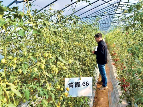 上海富農(nóng)種業(yè)有限公司總經(jīng)理胡繼軍考察“青霞66”番茄產(chǎn)品性狀。