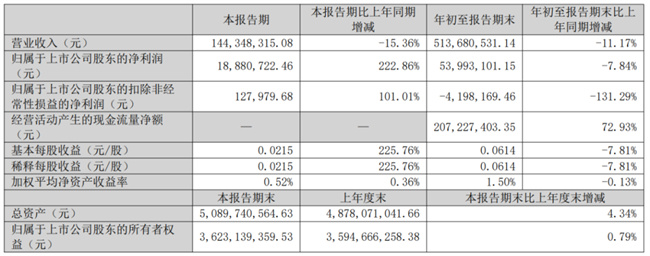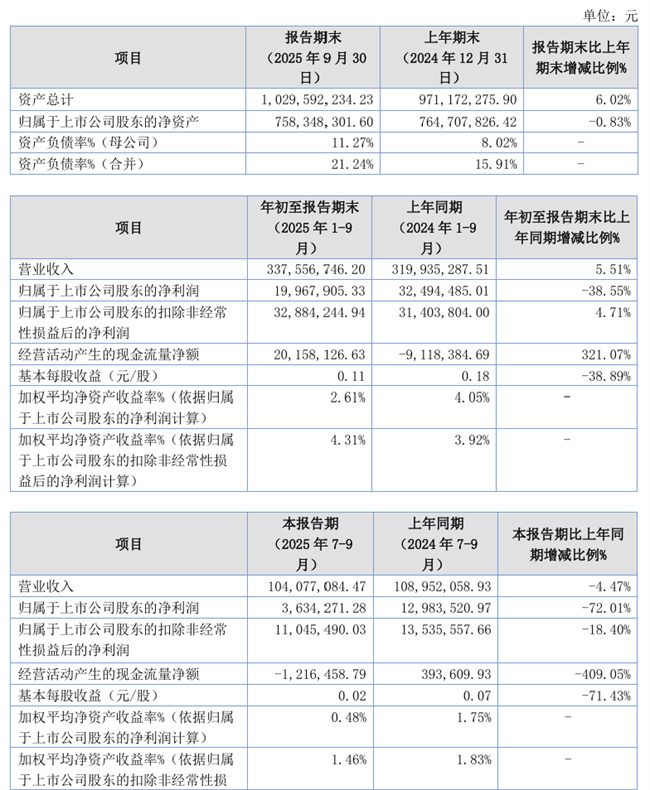 2025年第三季度,公司單季度主營收入1.44億元,同比下降15.36%;單季度歸母凈利潤1888.07萬元,同比上升222.86%。
