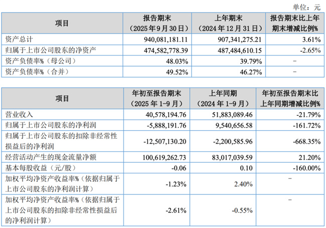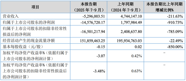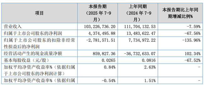 凈利潤方面,前三季歸母凈利潤為-588.82萬元,同比下降161.72%,較上年同期由盈轉(zhuǎn)虧。第三季度單季虧損1457.67萬元,同比大幅下降910.73%。