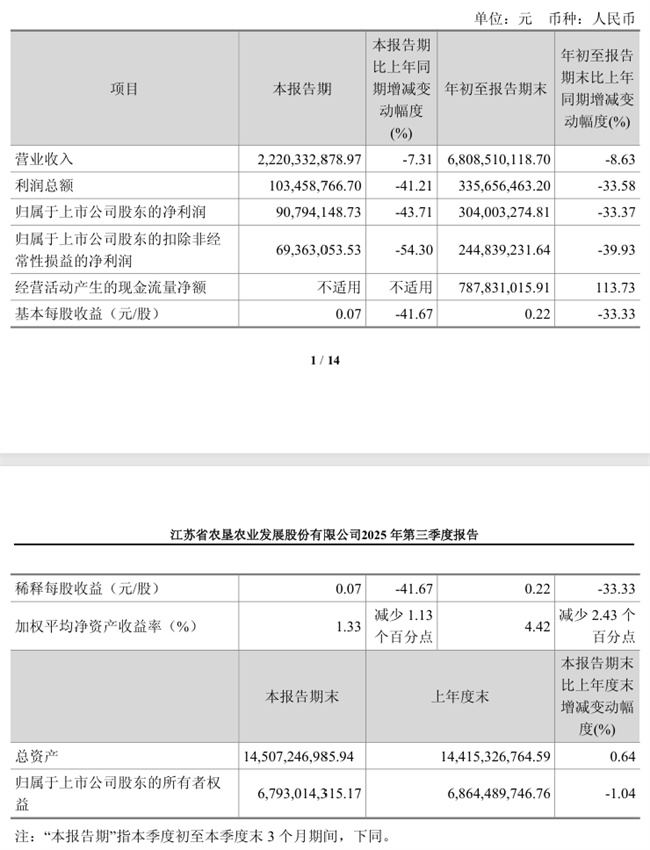 蘇墾農(nóng)發(fā)前三季營業(yè)收入68.09億元,同比下降8.63%,歸母凈利潤3.04億元,同比下降33.37%。第三季度單季營收22.2億元,同比下降7.31%,歸母凈利潤9079.41萬元,同比下降43.71%