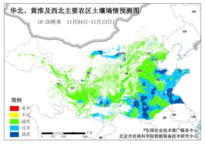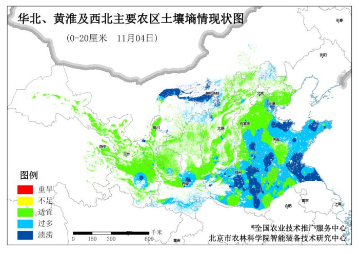 11月4日全國(guó)土壤墑情監(jiān)測(cè)系統(tǒng)數(shù)據(jù)顯示,北方冬麥區(qū)土壤墑情整體趨勢(shì)向好。0—20cm土層平均土壤相對(duì)含水量為92.08%。漬澇區(qū)域占總面積的13.29%,墑情過(guò)多區(qū)域占比33.10%,墑情適宜區(qū)域占比51.44%。漬澇區(qū)域占比環(huán)比(與10月28日相比)下降10.35個(gè)百分點(diǎn),適宜區(qū)域占比環(huán)比上升13.56個(gè)百分點(diǎn)。具體來(lái)看,漬澇與墑情過(guò)多區(qū)域主要分布在山東東部和西南部、河南大部、江蘇和安徽淮河以北、陜西渭北和關(guān)中等地。