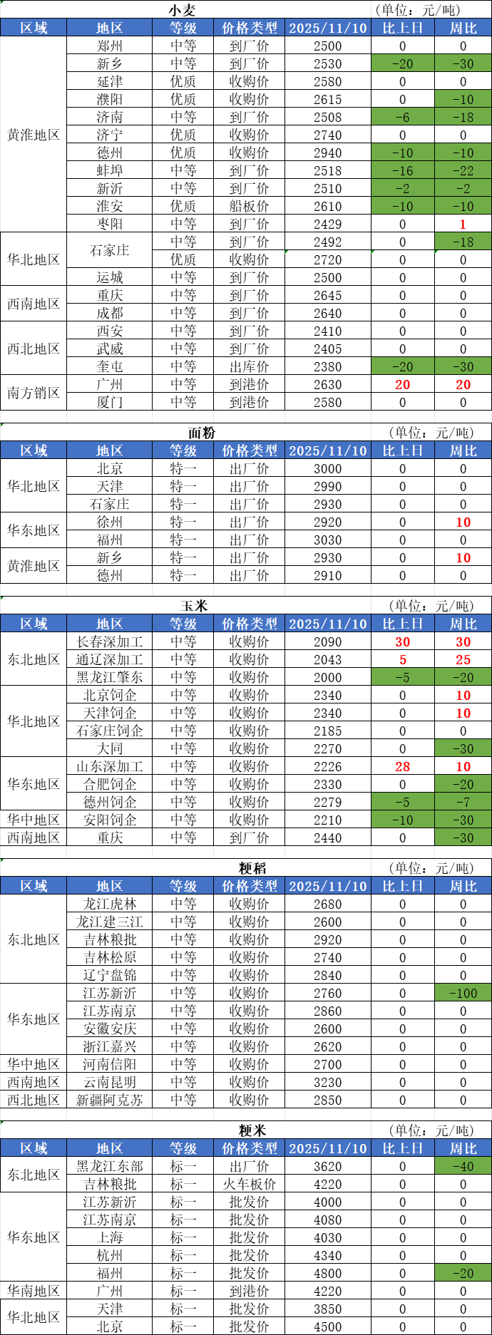 1、11月10日,主產(chǎn)區(qū)小麥市場(chǎng)價(jià)格延續(xù)下跌趨勢(shì),落價(jià)區(qū)域集中在河南、安徽等地,跌幅在3-8厘。例如新鄉(xiāng)五得利落5厘執(zhí)行1.265元/斤,延津克明落3厘執(zhí)行1.27元/斤,遂平今麥郎落5厘執(zhí)行1.275元/斤。