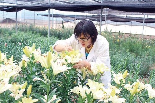 科研人員在基地對(duì)百合進(jìn)行雜交育種工作。 受訪(fǎng)者供圖
