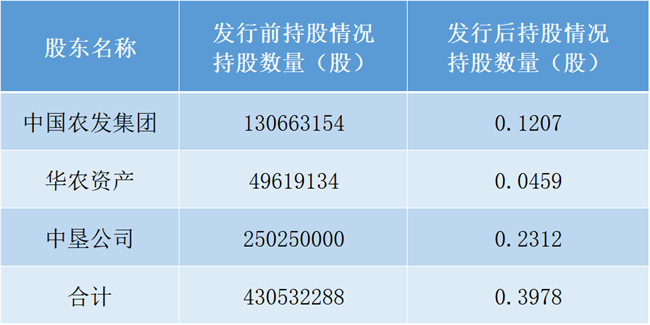 發(fā)行完成后,公司總股本將由1,082,198,663股增至1,161,373,969股。中國農(nóng)發(fā)集團直接持股比例將從12.07%提升至16.39%,通過全資子公司華農(nóng)資產(chǎn)、中墾公司間接持股比例分別為5.95%、21.55%,合計持股比例達43.89%,公司控制權(quán)保持穩(wěn)定。