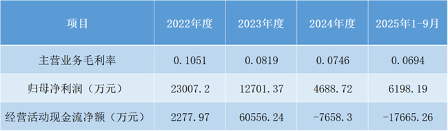 針對問詢函關(guān)注的經(jīng)營業(yè)績問題,公司披露,2022年至2025年1-9月,公司主營業(yè)務(wù)毛利率分別為10.51%、8.19%、7.46%和6.94%,呈逐步下滑趨勢;歸母凈利潤分別為2.30億元、1.27億元、0.47億元和0.62億元,波動特征顯著。