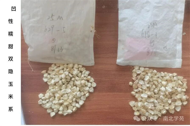 用兩個同樣甜糯雙隱基因系(如sh2/sh2、wx/wx)雜交組配產(chǎn)生的雜交種基因型是(wx/ sh2+/wx/ sh2),種植后長出的果穗上籽粒均為是超甜型雙隱性籽粒(sh2/sh2、wx/wx);其他甜質(zhì)類型同理。這一類雜交種甜度略低,口感好、品質(zhì)好。代表品種:中甜白小胖等。