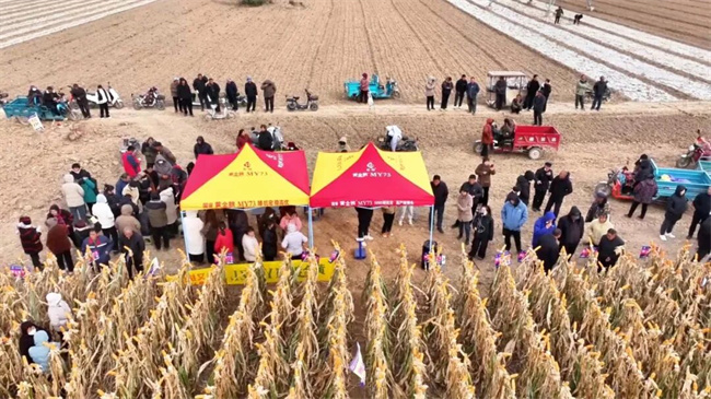 11月17日,黃金糧MY73觀摩培訓會在河南安陽滑縣成功舉行。本次活動旨在全面展示黃金糧MY73在極端氣候條件下的綜合表現(xiàn),并分享高產栽培技術。來自滑縣及周邊地區(qū)的種植戶、零售商代表齊聚一堂,通過實地觀摩和現(xiàn)場測產,進一步增強了對黃金糧MY73的種植信心。