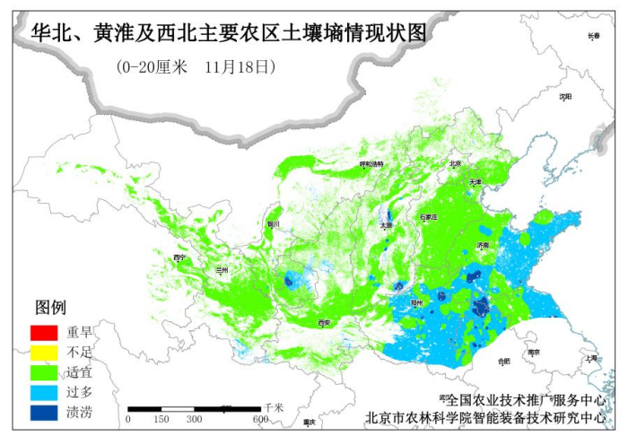 11月18日全國(guó)土壤墑情監(jiān)測(cè)系統(tǒng)數(shù)據(jù)顯示,北方冬麥區(qū)土壤墑情整體趨勢(shì)向好。0—20cm土層平均土壤相對(duì)含水量為84.07%。漬澇區(qū)域占總面積的8.91%,墑情過(guò)多區(qū)域占比28.53%,墑情適宜區(qū)域占比62.56%。漬澇區(qū)域占比環(huán)比(與11月11日相比)下降1.36個(gè)百分點(diǎn),適宜區(qū)域占比環(huán)比上升4.11個(gè)百分點(diǎn)。具體來(lái)看,漬澇與墑情過(guò)多區(qū)域主要分布在河南大部、山東西南和東部、江蘇和安徽淮河以北等地。