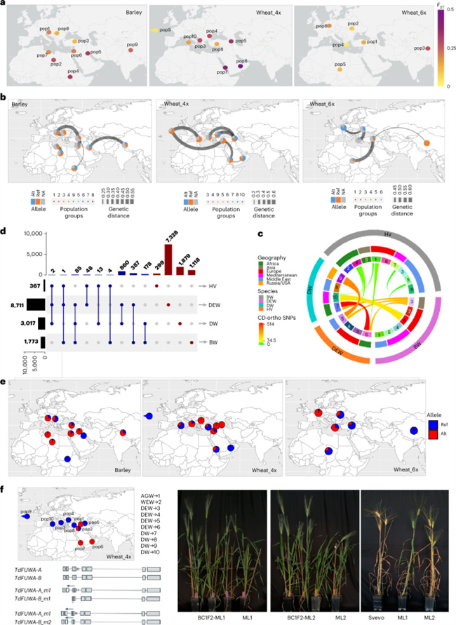 例如:一個調(diào)控開花時間的基因OSMADS50,在六倍體小麥中有一個等位基因在南方群體中被固定,而在大麥和四倍體小麥中卻不存在。這提示可以通過“跨作物育種”,將小麥中的這個等位基因引入到大麥或四倍體小麥中,以改良其適應(yīng)性。一旦功能驗證完成,即可通過基因編輯或回交將該等位基因快速導(dǎo)入,從而拓寬其他作物的緯度適應(yīng)范圍。