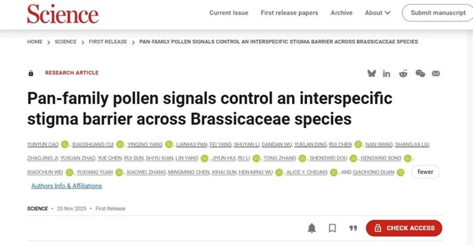 智種資訊在線:11月21日山東農(nóng)業(yè)大學(xué)段巧紅教授團(tuán)隊在《科學(xué)》(Science)在線發(fā)表重大成果,成功鑒定出觸發(fā)十字花科植物遠(yuǎn)緣生殖隔離的關(guān)鍵花粉信號分子SIPS,解析了遠(yuǎn)緣花粉與雌蕊柱頭的識別機(jī)制,并基于此開發(fā)出高效的遠(yuǎn)緣育種技術(shù)體系。
