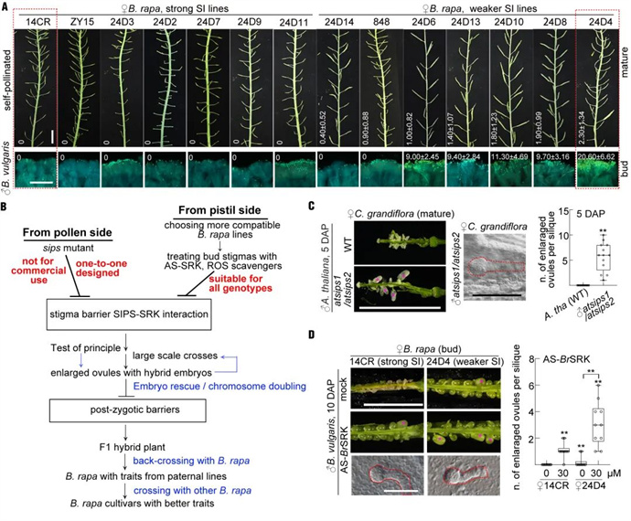 這一發(fā)現(xiàn)對農(nóng)業(yè)育種有著深遠(yuǎn)的意義。在傳統(tǒng)的遠(yuǎn)緣雜交中,由于生殖隔離,種間雜交的成功率低,許多寶貴的野生基因未能有效引入栽培種。SIPS-SRK系統(tǒng)的發(fā)現(xiàn),使得利用野生近緣種進(jìn)行作物改良成為可能。研究團(tuán)隊通過突變SIPS,成功打破了白菜與遠(yuǎn)緣種之間的生殖隔離,顯著提高了雜交胚的獲得率,為遠(yuǎn)緣育種提供了新型的高效方法。