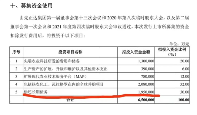 據(jù)悉,本次IPO,先正達(dá)擬募資650億元,其中130億元計劃投入尖端農(nóng)業(yè)科技研發(fā)的費用和儲備,39億元用于生產(chǎn)資產(chǎn)的擴(kuò)展、升級和維護(hù)以及其他資本支出,78億元用于擴(kuò)展現(xiàn)代農(nóng)業(yè)技術(shù)服務(wù)平臺(MAP),208億元用于全球并購項目,剩余195億元用于償還長期債務(wù)。