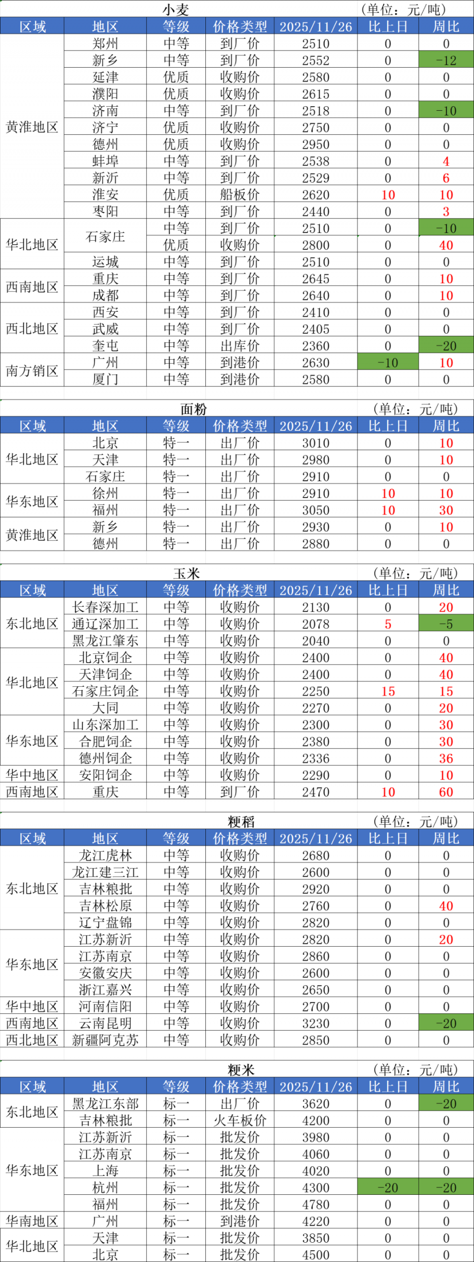 1、11月26日,小麥市場價格整體平穩(wěn)運行,部分區(qū)域粉企靈活調(diào)整收購價格。山東區(qū)域有零星粉企上調(diào)收購價,河南、陜西局部制粉企業(yè)小幅下調(diào)收購價,例如聊城華統(tǒng)麥價上漲3厘執(zhí)行1.247元/斤,單縣飛翔下跌2厘執(zhí)行1.278元/斤。