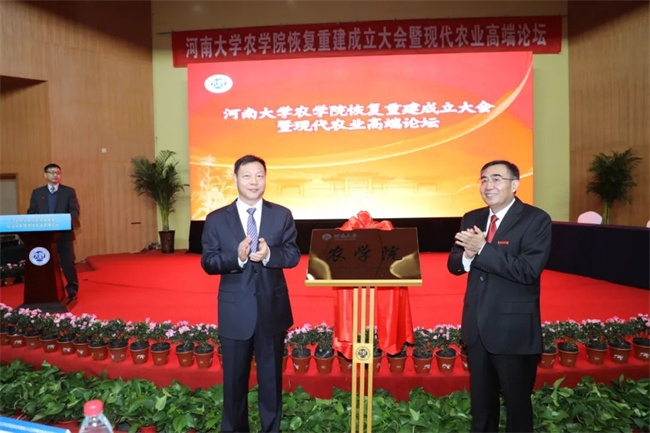 2020年12月26日,河南大學(xué)農(nóng)學(xué)院恢復(fù)重建成立大會(huì)暨現(xiàn)代農(nóng)業(yè)高端論壇舉行,河南大學(xué)農(nóng)學(xué)院正式揭牌。河南大學(xué)校長(zhǎng)宋純鵬表示,河南大學(xué)農(nóng)學(xué)院恢復(fù)重建是河南大學(xué)農(nóng)學(xué)學(xué)科發(fā)展的新起點(diǎn),承載著學(xué)科延續(xù)發(fā)展的重任和希望。河南大學(xué)農(nóng)學(xué)院將繼承優(yōu)良的學(xué)科發(fā)展傳統(tǒng),利用綜合性大學(xué)學(xué)科優(yōu)勢(shì),聚焦現(xiàn)代農(nóng)業(yè)發(fā)展趨勢(shì),在農(nóng)業(yè)分子育種、合成生物學(xué)、信息農(nóng)業(yè)、智慧農(nóng)業(yè)等方面,進(jìn)一步完善學(xué)科發(fā)展體系,培養(yǎng)適應(yīng)現(xiàn)代農(nóng)業(yè)發(fā)展需求的高素質(zhì)人才,匯聚一支高水平的教學(xué)科研隊(duì)伍,加快產(chǎn)出具有較大影響和標(biāo)志性意義的研究成果。