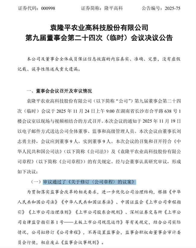 2025年11月24日,隆平高科公告稱,公司召開第九屆董事會第二十四次(臨時)會議,審議通過了包括修訂《公司章程》及多項治理制度、不再設置監(jiān)事會在內的重要議案。