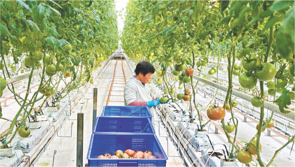 日前,慶云縣,山東水發(fā)航天現(xiàn)代農業(yè)產(chǎn)業(yè)園智慧溫室內,工人正在采摘番茄。