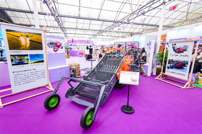 廣東薯業(yè)全產(chǎn)業(yè)鏈成果展展示新產(chǎn)品——自走式薯類聯(lián)合收獲機(jī)。