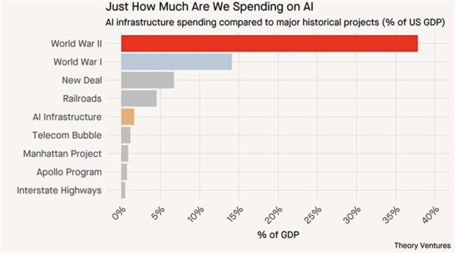 美國(guó)擔(dān)心什么?擔(dān)心在人工智能時(shí)代的技術(shù)領(lǐng)導(dǎo)權(quán)上,被中國(guó)超越。因此你會(huì)看到:芯片補(bǔ)貼;限制出口;擴(kuò)建電網(wǎng);軍民算力融合;政府推動(dòng)資本持續(xù)流入數(shù)據(jù)中心——這已經(jīng)是國(guó)家動(dòng)員式擴(kuò)張。全球數(shù)據(jù)中心投入預(yù)計(jì)到2028年底超3萬(wàn)億美元; OpenAI 與 Anthropic 估值總和接近 5000 億美元;美國(guó) GDP 增長(zhǎng)的 40% 來(lái)自 AI。