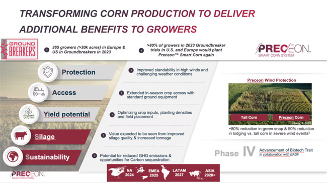 護(hù)城河如何落地?以 PRECEON 為例,這是拜耳的矮稈玉米新品系。但“短”并不是關(guān)鍵,精準(zhǔn)種植才是核心。