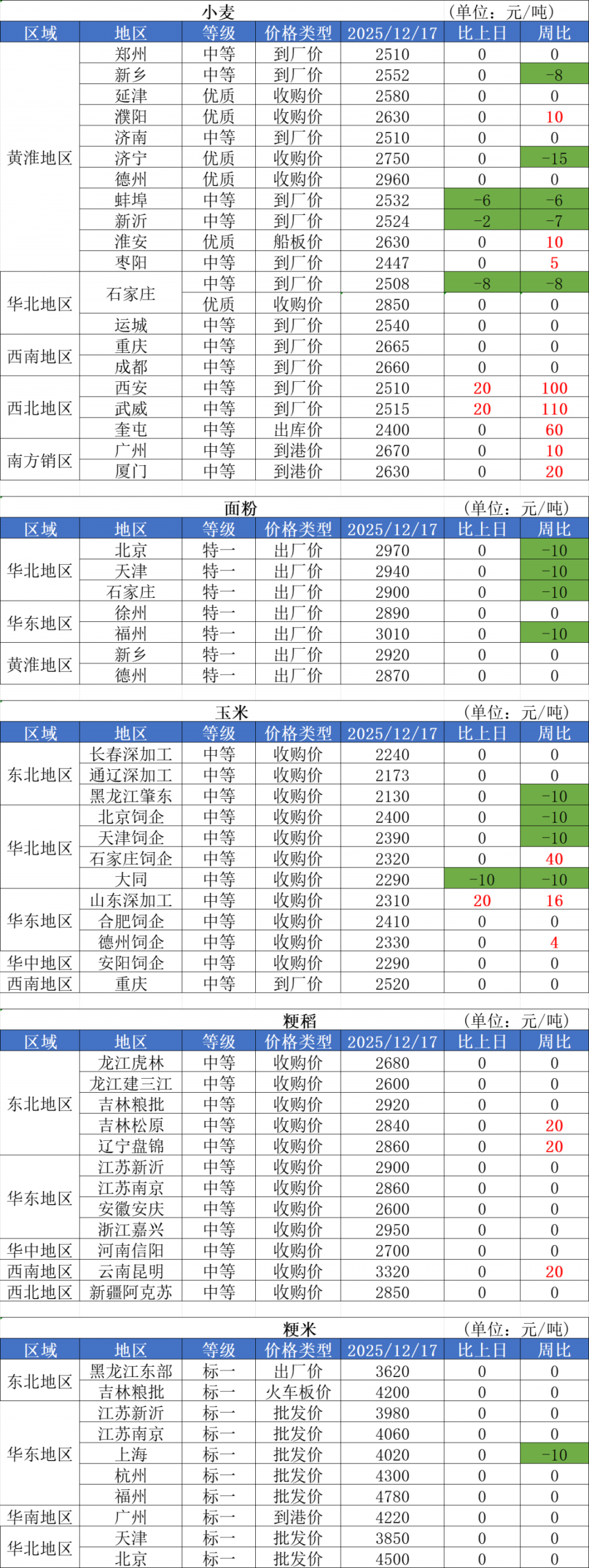 1、12月17日,小麥加工企業(yè)收購價格全線下跌,年前貿(mào)易商為償還資金而選擇出庫變現(xiàn),市場上小麥上量節(jié)奏加快,山東、河北、河南、江蘇、安徽等主產(chǎn)區(qū)均有多家企業(yè)下調收購價格,跌幅在5厘以內。
