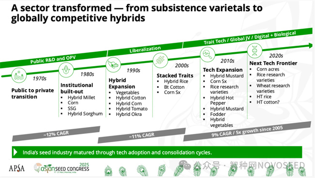 印度種子產(chǎn)業(yè)歷經(jīng)多個技術(shù)采用與市場整合周期,目前已進入相對成熟的發(fā)展階段。其演變大致可分為以下幾個關(guān)鍵時期: