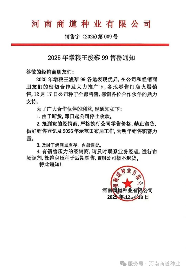 近日,河南商道種業(yè)有限公司旗下核心品種”墩糧王浚黎99“傳來捷報:截至2025年12月17日,本公司該品種種子已實(shí)現(xiàn)全面售罄。這一成果,是市場對浚黎99品種優(yōu)勢的高度認(rèn)可,更離不開各位經(jīng)銷商伙伴的緊密協(xié)作與全力推廣。
