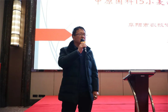阜陽市農(nóng)技推廣中心原主任、阜陽市農(nóng)技協(xié)聯(lián)合會副會長兼秘書長鄧坤在專題匯報中系統(tǒng)介紹了“中原國科15號”的品種特性。該品種為國審強筋小麥,具備矮稈抗倒、品質(zhì)穩(wěn)定、適應性廣等特點,并在生產(chǎn)實踐中創(chuàng)造了安徽省小麥單產(chǎn)高產(chǎn)記錄。