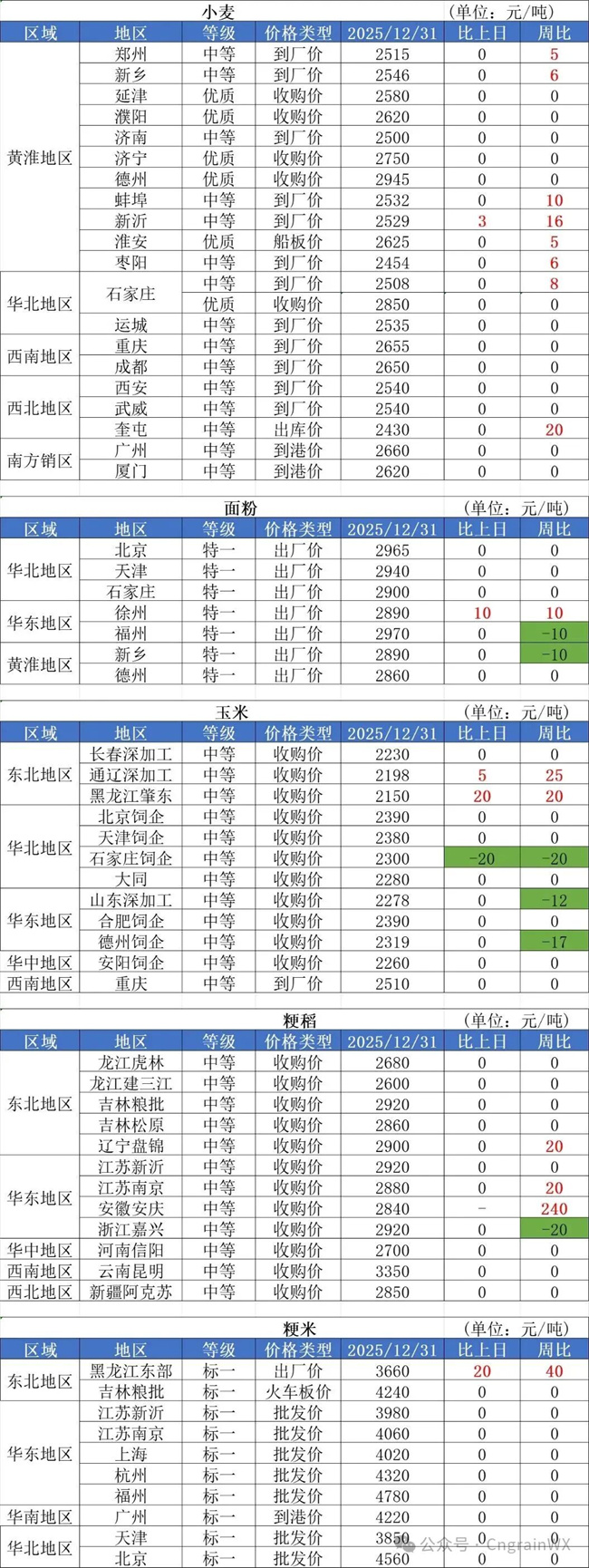 1、12月31日,小麥市場價格整體持穩(wěn),部分制粉企業(yè)小范圍下跌,跌幅在2-5厘。短期小麥?zhǔn)袌鲇^望情緒濃厚,多家面粉廠公布了元旦放假通知,暫時停收。