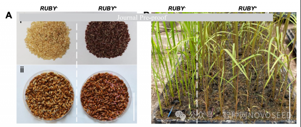 此外,本研究將ASPT系統(tǒng)成功拓展至水稻體系。通過靶向編輯育性基因OsMs45,創(chuàng)制出攜帶穩(wěn)定紅色RUBY標(biāo)記的保持系。在種子階段,去除穎殼后RUBY顏色清晰可辨,支持自動化色選,準確率達99.92%。