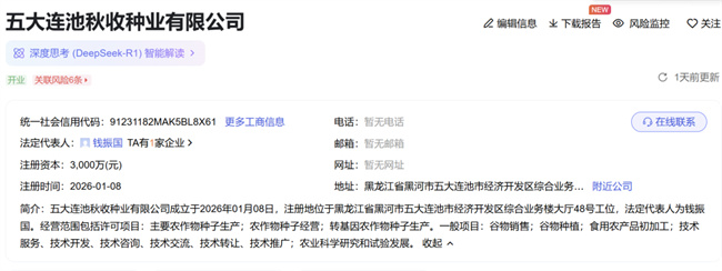 天眼查顯示,近日,五大連池秋收種業(yè)有限公司成立,法定代表人為錢(qián)振國(guó),注冊(cè)資本3000萬(wàn)人民幣,由山東秋收種業(yè)有限公司全資持股。