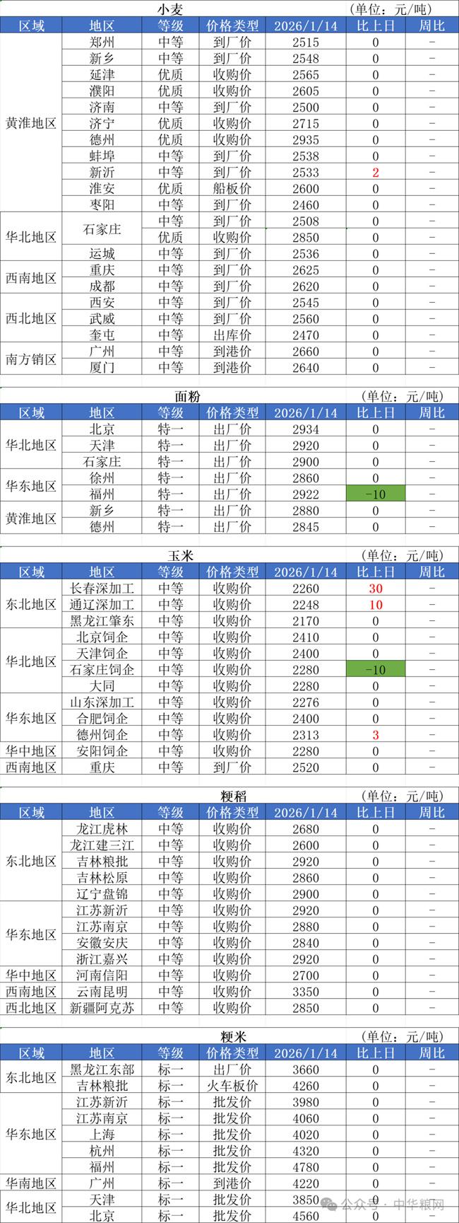 1、1月14日,國內(nèi)小麥收購價格穩(wěn)中局部上漲,山東、河北、江蘇零星制粉企業(yè)上調(diào)收購價格,幅度在2-3厘。14日第二期托市收購小麥開啟了拍賣,本次計(jì)劃銷售總量20.06萬噸,實(shí)際成交16.14萬噸,成交率80.5%。