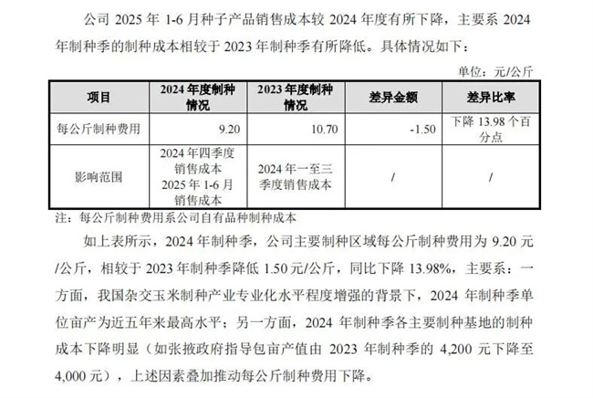 正大種業(yè)將其歸結(jié)為“發(fā)貨節(jié)奏提前”與“制種成本紅利”的雙重作用。公司稱,受暖冬預(yù)期和2025年春節(jié)提前的影響,經(jīng)銷(xiāo)商在2024年第四季度集中提貨,導(dǎo)致2025年上半年需求透支。而在利潤(rùn)端,2024年制種季每公斤制種成本從上一年的10.70元大幅降至9.20元,降幅達(dá)13.98%,直接推高了2025年上半年的毛利率。