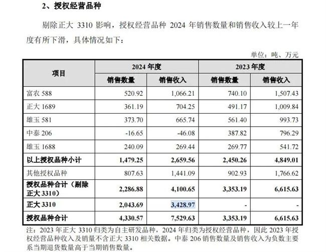 在正大種業(yè)的產(chǎn)品矩陣中,“正大3310”無(wú)疑是近年來(lái)的明星單品。2024年該品種銷(xiāo)售收入達(dá)到3428.97萬(wàn)元,成為公司第四大單品。然而,二輪回復(fù)披露了一個(gè)細(xì)節(jié):正大3310的植物新品種權(quán)已于2024年3月轉(zhuǎn)讓給了隆平高科(000998),目前正大種業(yè)僅擁有該品種的“獨(dú)家生產(chǎn)經(jīng)營(yíng)授權(quán)”。