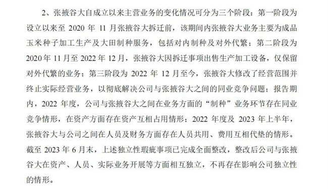 二輪回復(fù)中,正大種業(yè)承認(rèn)2022年和2023年上半年公司與張掖谷大存在“業(yè)務(wù)同業(yè)競(jìng)爭(zhēng)、資產(chǎn)相互占用、人員共用、費(fèi)用代墊”等獨(dú)立性瑕疵,并聲稱已于2023年6月末完成整改。然而,代繁業(yè)務(wù)在2024年的大幅回落(降至1558萬(wàn)元)以及2025年上半年僅存78萬(wàn)元的現(xiàn)狀,更加深了市場(chǎng)對(duì)其作為業(yè)績(jī)“調(diào)節(jié)工具”的懷疑。