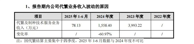 2023年,正大種業(yè)承接了張掖谷大的代繁業(yè)務(wù),當(dāng)年代繁業(yè)務(wù)收入驟增至3993萬(wàn)元,監(jiān)管質(zhì)疑其是否存在通過(guò)代繁業(yè)務(wù)調(diào)節(jié)業(yè)績(jī)、減緩主業(yè)下滑的情形。