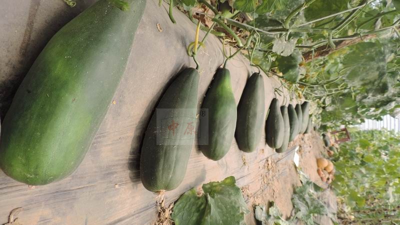 鄭州中原西甜研究所最新育成羊角蜜雜種。羊角蜜是農(nóng)家常規(guī)品種,瓜農(nóng)習(xí)慣自己留種,因此種性嚴(yán)重退化,不抗病,糖度低、瓜小產(chǎn)量低,瓜形皮色不一致。真對(duì)上述原因利用現(xiàn)代育種手段選育代替品種顯得及其重要。我們首先對(duì)羊角蜜進(jìn)行多代提純復(fù)壯,選取優(yōu)良單株作母本雜交。后代觀(guān)察5※11比較復(fù)合育種目標(biāo),雜交優(yōu)勢(shì)明顯。經(jīng)2013年冬季云南耿馬試驗(yàn)和2014年春昌樂(lè),河南中牟大棚試種,周口扶溝大李莊鄉(xiāng)露地試驗(yàn)結(jié)果表現(xiàn):早熟性與羊蜜相當(dāng),高溫季節(jié)栽培花后25天采收。雌花早生,而密。第一雌花著生在子蔓第一片葉液間,以后一片葉一個(gè)雌花。子蔓、孫蔓均可結(jié)瓜,連續(xù)結(jié)瓜性強(qiáng),單株結(jié)4~9個(gè)。果形長(zhǎng)棒錘形,縱徑26cm,橫徑8cm,肉厚2cm。皮色墨綠,肉綠色,瓜瓤桔紅色。肉厚種腔小。熟瓜香酥脆甜多汁,適口性極佳,科學(xué)含糖度15%。單瓜重1-2kg,畝產(chǎn)5000kg左右。產(chǎn)量與羊角蜜比較提高20%。抗病性超越羊角蜜,田間觀(guān)察對(duì)照白粉病、角斑病、霜霉病發(fā)病率降低??鼓嫘詮?qiáng)適應(yīng)廣。適宜各甜瓜產(chǎn)區(qū)各種栽培模式種植。露地栽培對(duì)整枝打杈要求不嚴(yán)格,管理粗放,很適合大面積懶漢種植。雜交后代外觀(guān)形狀與羊角蜜區(qū)別較大,所以新命名:中原口福香瓜