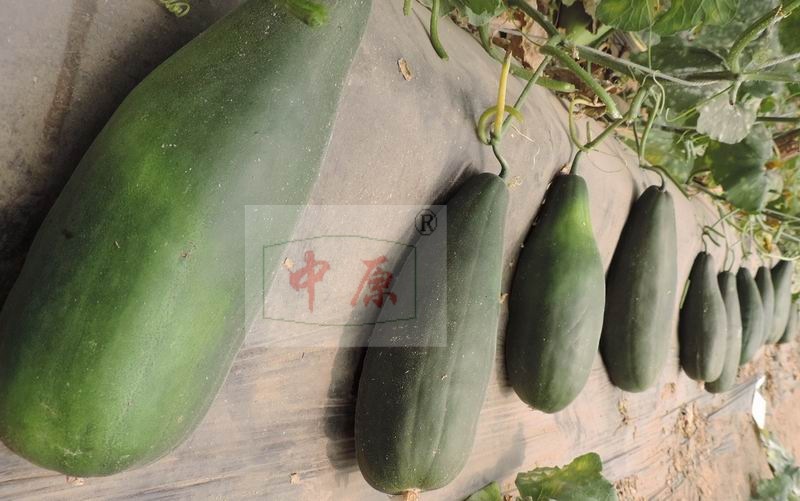 鄭州中原西甜研究所最新育成羊角蜜雜種。羊角蜜是農(nóng)家常規(guī)品種,瓜農(nóng)習(xí)慣自己留種,因此種性嚴(yán)重退化,不抗病,糖度低、瓜小產(chǎn)量低,瓜形皮色不一致。真對上述原因利用現(xiàn)代育種手段選育代替品種顯得及其重要。我們首先對羊角蜜進行多代提純復(fù)壯,選取優(yōu)良單株作母本雜交。后代觀察5※11比較復(fù)合育種目標(biāo),雜交優(yōu)勢明顯。經(jīng)2013年冬季云南耿馬試驗和2014年春昌樂,河南中牟大棚試種,周口扶溝大李莊鄉(xiāng)露地試驗結(jié)果表現(xiàn):早熟性與羊蜜相當(dāng),高溫季節(jié)栽培花后25天采收。雌花早生,而密。第一雌花著生在子蔓第一片葉液間,以后一片葉一個雌花。子蔓、孫蔓均可結(jié)瓜,連續(xù)結(jié)瓜性強,單株結(jié)4~9個。果形長棒錘形,縱徑26cm,橫徑8cm,肉厚2cm。皮色墨綠,肉綠色,瓜瓤桔紅色。肉厚種腔小。熟瓜香酥脆甜多汁,適口性極佳,科學(xué)含糖度15%。單瓜重1-2kg,畝產(chǎn)5000kg左右。產(chǎn)量與羊角蜜比較提高20%??共⌒猿窖蚪敲郏镩g觀察對照白粉病、角斑病、霜霉病發(fā)病率降低??鼓嫘詮娺m應(yīng)廣。適宜各甜瓜產(chǎn)區(qū)各種栽培模式種植。露地栽培對整枝打杈要求不嚴(yán)格,管理粗放,很適合大面積懶漢種植。雜交后代外觀形狀與羊角蜜區(qū)別較大,所以新命名:中原口福香瓜