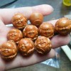 美國猴頭核桃工藝品常見的加工制作方法有三種。第一,對果個小巧、果形正圓或矮樁、果殼紋路通達的猴頭核桃,可直接打孔,穿珠成串。第二,對果形正圓或接近正圓的猴頭核桃,按粒徑大小挑選、劃分,經精心打磨、拋光后,制成手串或長串。第三,通過雕刻,進一步提高猴頭核桃的欣賞價值、實用價值和收藏價值。第三種方式最能彰顯猴頭核桃的特點,也給核雕師提供了充分發(fā)揮想象力,盡情展露才華和技能的廣闊空間。雕刻的造型素材可以是常見的猴頭,也可以是各種人物(例如:壽星、萌娃、美女、不倒翁)、神靈(例如:彌勒佛、財神、鐘馗)、其他動物(例如:大猩猩、熊貓、獅、虎、犀牛、河馬)、吉祥文字(例如:吉、祥、如、意、福、祿、財、壽)等。雕好的物件可穿珠成串,也可單獨把玩,例如用作鑰匙墜、手包墜、手機掛墜、居室擺件等。