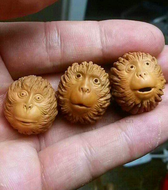 5. 雕刻品用途廣泛,“玩法”多樣。業(yè)內(nèi)人士通常把核雕品的玩法分為三種(有人稱為三種制式),即單個、成對和串活。單個和成對,其實就是大家常說的掛件和擺件;而串活則指的是作為串珠(念珠),制成手串、項串等。對于果個較大、所雕題材內(nèi)容比較完整的美國猴頭核桃雕刻品,可用作掛件或擺件,例如作為手機墜、手包墜、扇子墜、汽車內(nèi)掛等,或擺于案頭欣賞、握于手中把玩。對于果個較小、所雕題材相對簡單的美國猴頭核桃雕刻品(通常是猴頭),當(dāng)然是制作手串、長串的首選。需要說明的是,除了雕刻外,對于果形圓、果個小、果殼表面紋路美觀的美國猴頭核桃,就沒有必要雕刻了,直接用素珠穿串,即可成為上品;磨光珠穿串也是一種不錯的選擇。