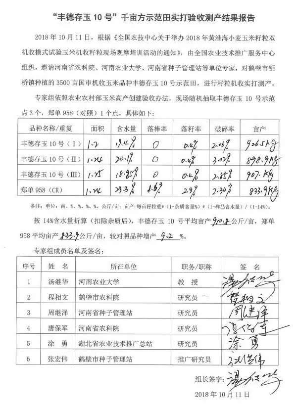 隨后,河南農(nóng)業(yè)大學湯繼華教授宣布:專家組依照農(nóng)業(yè)農(nóng)村部玉米高產(chǎn)創(chuàng)建驗收辦法,豐德存玉10號平均畝產(chǎn)910.8公斤,創(chuàng)造黃淮海地區(qū)籽粒機收高產(chǎn)記錄。