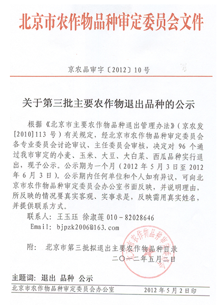 北京市第三批擬退出主要農(nóng)作物品種目錄