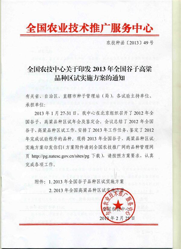 全國(guó)農(nóng)技中心關(guān)于印發(fā)2013年全國(guó)谷子高粱品種區(qū)試實(shí)施方案的通知