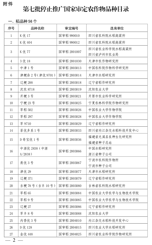 附件:第七批停止推廣國家審定農(nóng)作物品種目錄