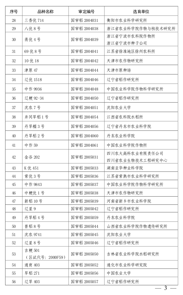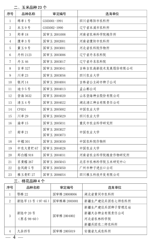 根據(jù)《主要農(nóng)作物品種審定辦法》有關(guān)規(guī)定,經(jīng)第三屆國家農(nóng)作物品種審定委員會第二次會議審議,并經(jīng)為期一個月的公示,決定停止推廣國家農(nóng)作物品種審定委員會(全國農(nóng)作物品種審定委員會)審定通過的108個稻、玉米、棉花、大豆品種,現(xiàn)予公告。