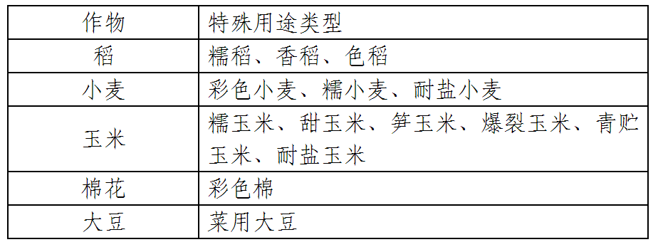 山東省農(nóng)作物品種審定委員會適時確定公布山東省特殊用途品種類型。目前確定的山東省主要農(nóng)作物特殊用途品種類型目錄見下表。自有品種屬于特殊用途品種的,可以自行進(jìn)行品種試驗(yàn),提交試驗(yàn)方案,經(jīng)審核確認(rèn)的試驗(yàn)納入省級品種試驗(yàn)統(tǒng)一管理。特殊用途品種試驗(yàn)要科學(xué)確定對照品種,試驗(yàn)點(diǎn)數(shù)不少于5個,分布于三個以上市級行政區(qū),其它要求參照省級品種試驗(yàn)管理辦法。