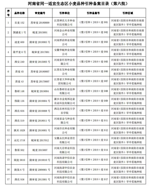 根據農業(yè)農村部《主要農作物品種審定辦法》(農業(yè)部令〔2016〕第4號)和河南省農業(yè)農村廳《關于開展同一適宜生態(tài)區(qū)品種引種備案工作的通知》(豫農種植〔2016〕49號)的規(guī)定,現將我省符合同一適宜生態(tài)區(qū)引種備案條件的41個小麥品種予以公布(第六批)。
