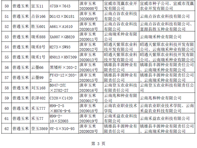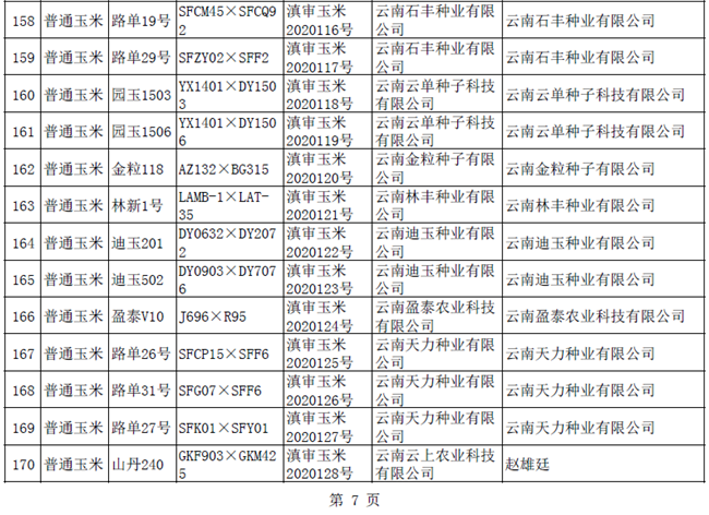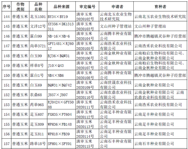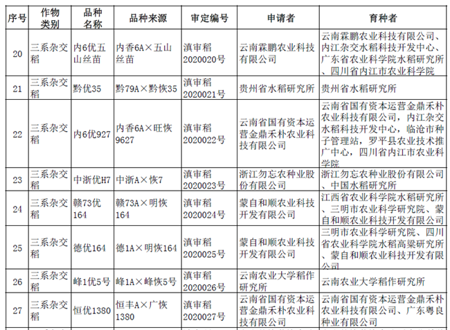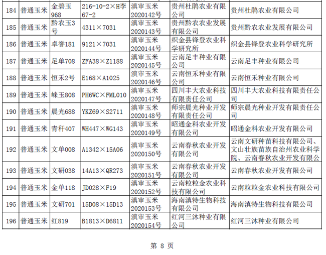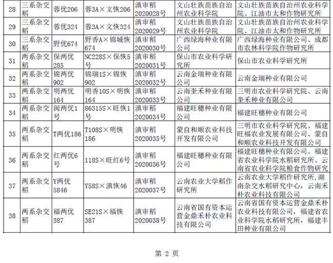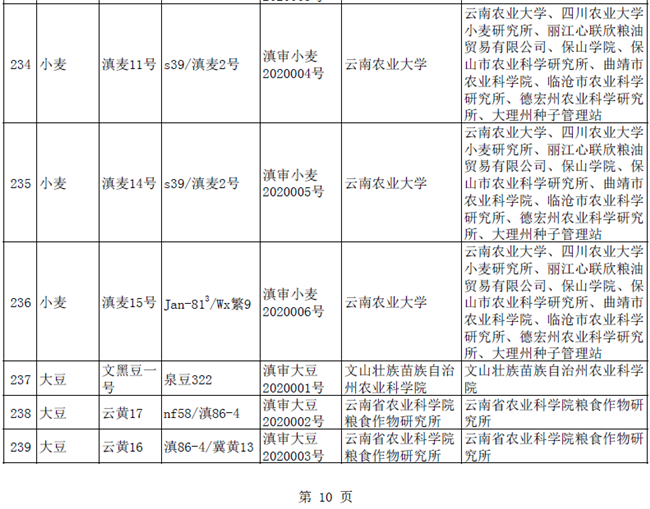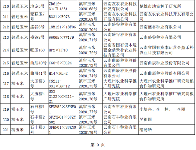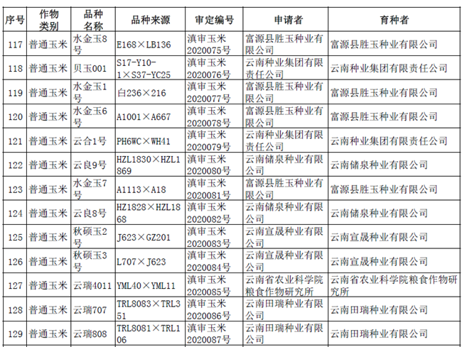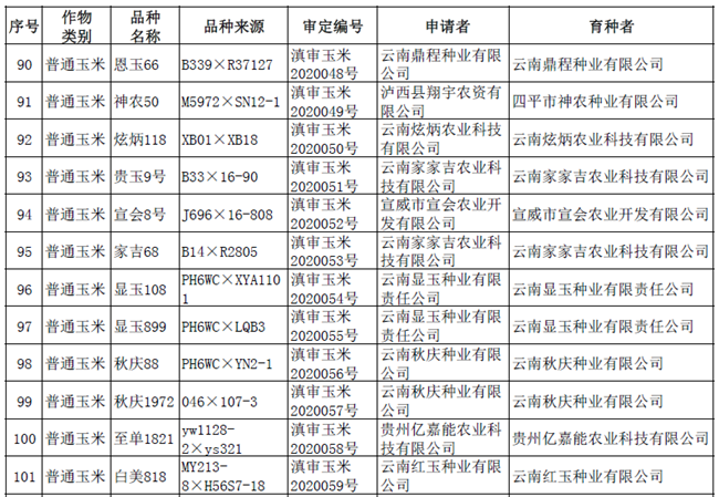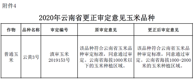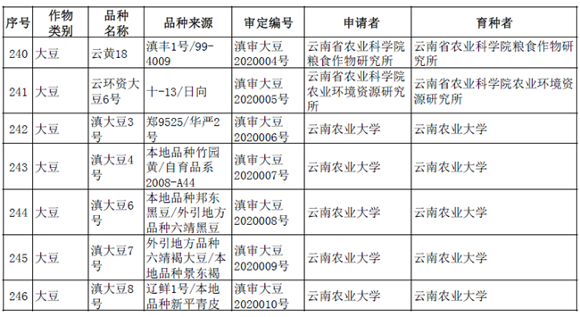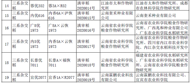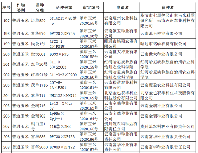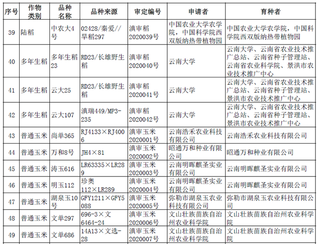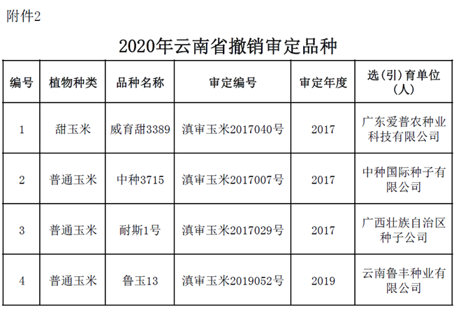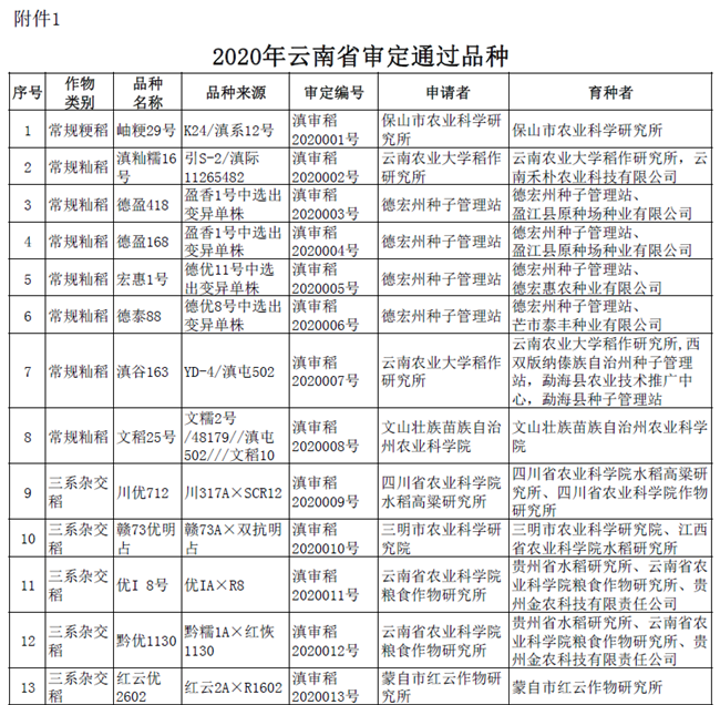 根據(jù)《中華人民共和國種子法》和農(nóng)業(yè)農(nóng)村部《主要農(nóng)作物品種審定辦法》的規(guī)定,云南省農(nóng)作物品種審定委員會于2020年7月31日在昆明召開了云南省第九屆農(nóng)作物品種審定委員會主任委員會第五次會議,審定通過了稻、玉米、大豆、小麥作物新品種246個(附件1,附件5);撤銷審定玉米品種4個(附件2);更改品種名稱玉米品種1個(附件3);更正審定意見玉米品種1個(附件4)。