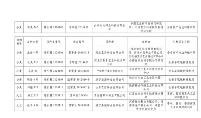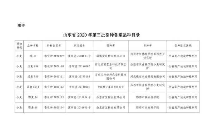 山東省2020年第三批主要農(nóng)作物引種備案品種通告